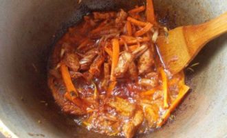 Отправить в казан морковь и редиску, обжаривать помешивая.