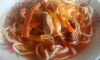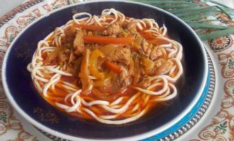 Ставим на огонь кастрюлю с подсоленной водой для варки лапши и начинаем ее тянуть, самая ответственная работа. На стол берем одну полосочку теста из тарелки и начинаем одной рукой раскатывать, а второй тянуть лапшинку дальше пальчиками. Чем-то похоже на то, если кто видел, как прядут нитки шерстяные на веретене, работа пальчиками та же. Не бойтесь, лапша упругая и не будет рваться, ну конечно если ее специально не тянуть!