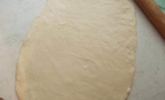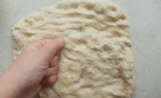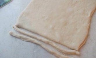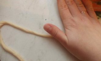 Через 15 минут достаем из пакета по одной полосочке и начинаем раскатывать ее на столе ладошкой, не сильно тонко.