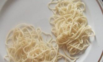 Бросаем в кипящую воду лапшу, варим 2 минуты и вытягиваем. Очень удобно это делать ложкой для спагетти с зубчиками. Сразу окунаем в холодную воду, пару секунд и на блюдо. Не бойтесь она не слипнется. Также поступаем со всей лапшой. Когда уже набьете руку, пока варится первая, прекрасно можно вытянуть вторую лапшу и так далее.