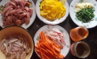 Тем временем, приготовим подлив для лагмана. Мясо, перец, лук, морковь и редис, порежем соломкой, чеснок и зелень мелко.