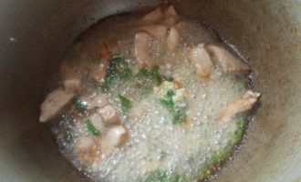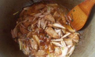 В казане разогреем масло, пока не пойдет дымок, сразу выкладываем мясо, посыпаем его чесноком и зеленью. Мешаем, пока не появится золотистый цвет. Это произойдет довольно быстро, поэтому советую, все держать под рукой уже в нарезанном виде.