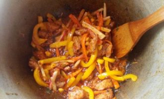 Затем перец, немного обжарить, не переставая мешать.