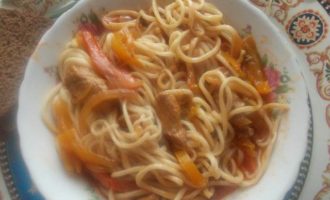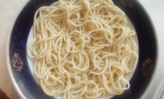 Когда лапша уже сварилась вся, выкладываем порции в каждую тарелку сразу…