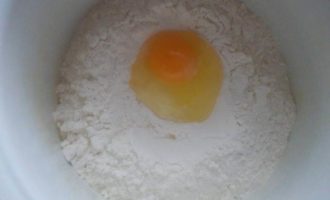 Начнем с лапши. В стакане воды (200 мл) разведем щепотку соли. В миску высыпаем муку и вбиваем яйцо. Перемешиваем и подливаем пару ложек воды, начинаем замешивать тесто.