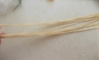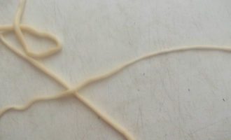 Сложно и тянуть лапшу и фотографировать, но я попытаюсь объяснить словами. После того, как мы пальчиками вытянули одну лапшу, она получится очень длинной. Сложив ее в несколько рядов, как ковбои веревку наматывают на локоть, мы берем за оба конца всю лапшу и бьем об стол несколько раз, как плеткой. Не бойтесь, она не порвется, а станет еще длиннее и ровнее.