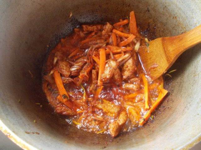 Отправить в казан морковь и редиску, обжаривать помешивая.