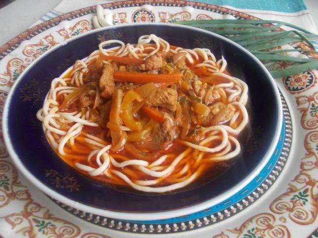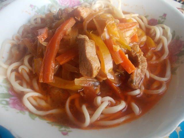 Ставим на огонь кастрюлю с подсоленной водой для варки лапши и начинаем ее тянуть, самая ответственная работа. На стол берем одну полосочку теста из тарелки и начинаем одной рукой раскатывать, а второй тянуть лапшинку дальше пальчиками. Чем-то похоже на то, если кто видел, как прядут нитки шерстяные на веретене, работа пальчиками та же. Не бойтесь, лапша упругая и не будет рваться, ну конечно если ее специально не тянуть!
