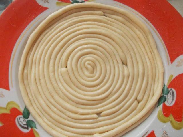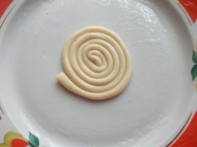Каждую раскатанную полоску скручиваем на тарелку смазанную маслицем.