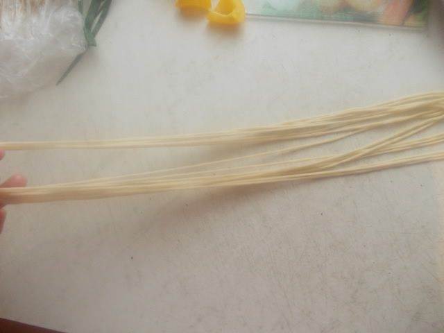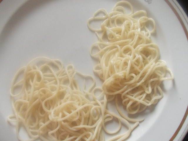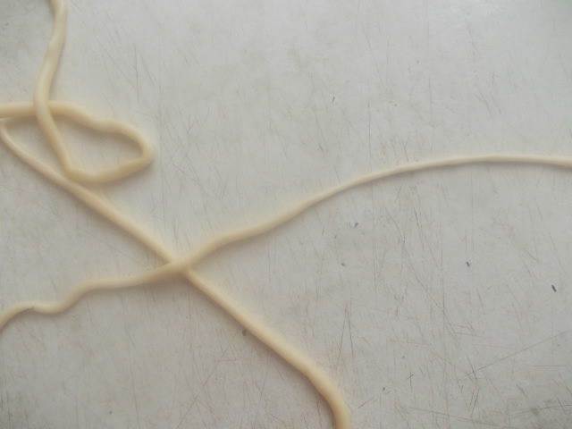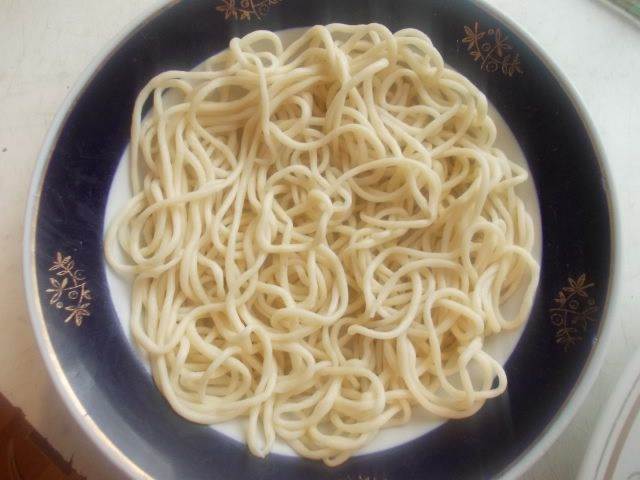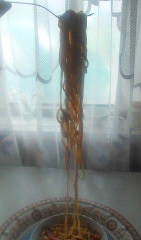Сложно и тянуть лапшу и фотографировать, но я попытаюсь объяснить словами. После того, как мы пальчиками вытянули одну лапшу, она получится очень длинной. Сложив ее в несколько рядов, как ковбои веревку наматывают на локоть, мы берем за оба конца всю лапшу и бьем об стол несколько раз, как плеткой. Не бойтесь, она не порвется, а станет еще длиннее и ровнее.