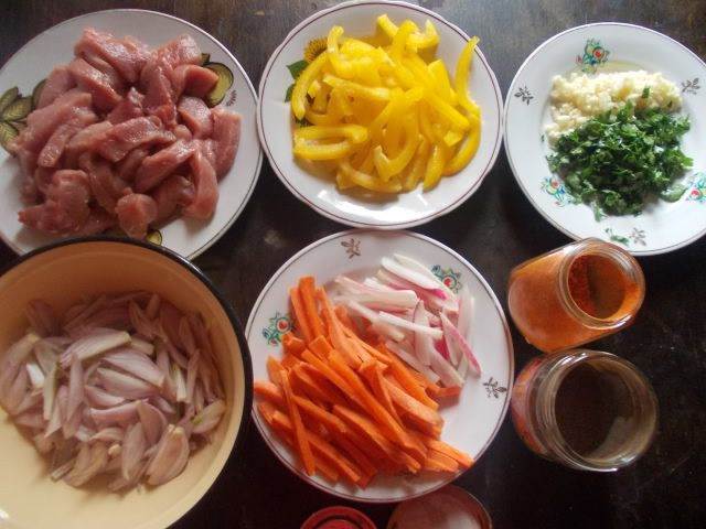 Тем временем, приготовим подлив для лагмана. Мясо, перец, лук, морковь и редис, порежем соломкой, чеснок и зелень мелко.