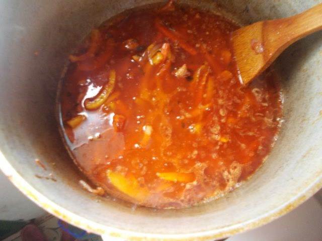 Затем наливаем воды или бульона, чтобы она покрывала овощи с мясом. Тушим пол часа.