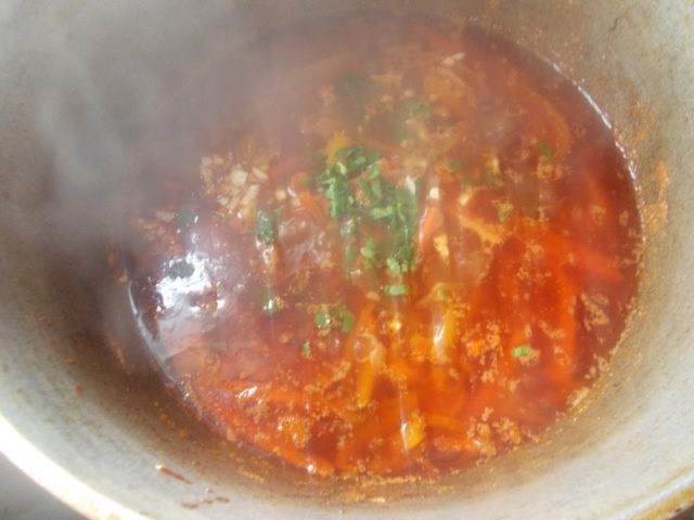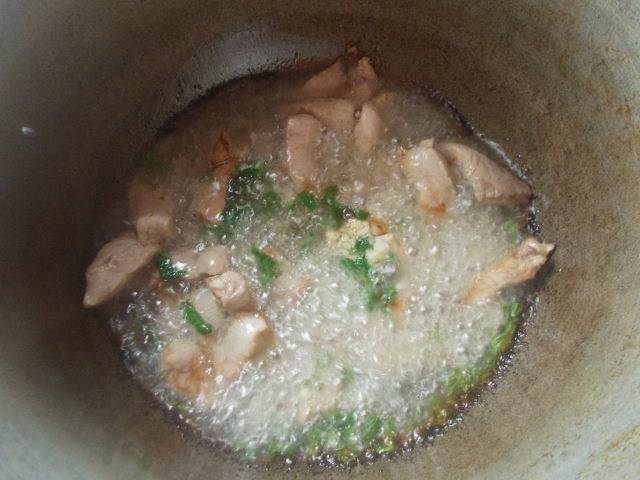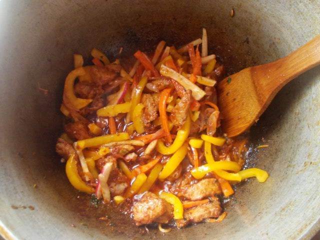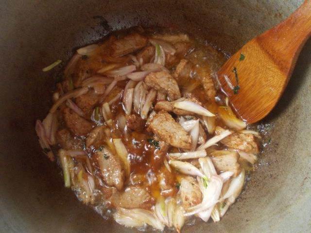В казане разогреем масло, пока не пойдет дымок, сразу выкладываем мясо, посыпаем его чесноком и зеленью. Мешаем, пока не появится золотистый цвет. Это произойдет довольно быстро, поэтому советую, все держать под рукой уже в нарезанном виде.