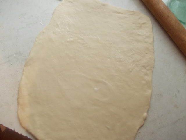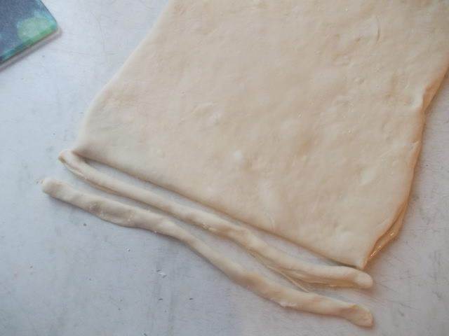 Через 15 минут достаем из пакета по одной полосочке и начинаем раскатывать ее на столе ладошкой, не сильно тонко.