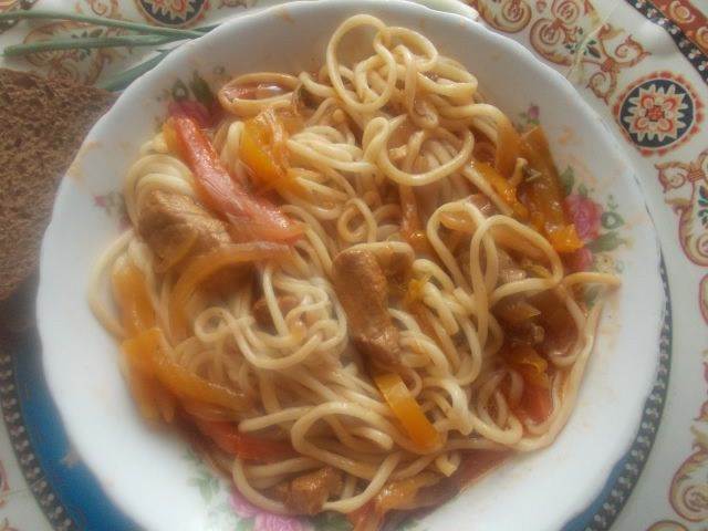 Когда лапша уже сварилась вся, выкладываем порции в каждую тарелку сразу…