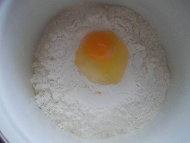 Начнем с лапши. В стакане воды (200 мл) разведем щепотку соли. В миску высыпаем муку и вбиваем яйцо. Перемешиваем и подливаем пару ложек воды, начинаем замешивать тесто.