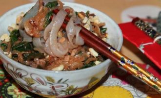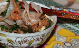 Выкладываем в пиалу нашу лапшу, посыпаем орехами и подаем.