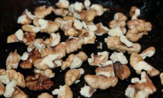Горсть грецких орехов подсушиваем на сухой сковороде (у меня чугунная). Затем крупно рубим ножом.