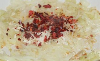 Лук режем полукольцами и на растительном масле доводим до прозрачности. Затем добавляем перцы и чеснок и, помешивая, доводим до готовности в течение 1 минутки.