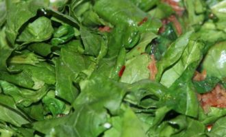 Шпинат накрываем крупными кусками и отправляем в сковороду с соусом.