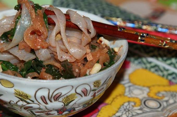Выкладываем в пиалу нашу лапшу, посыпаем орехами и подаем.