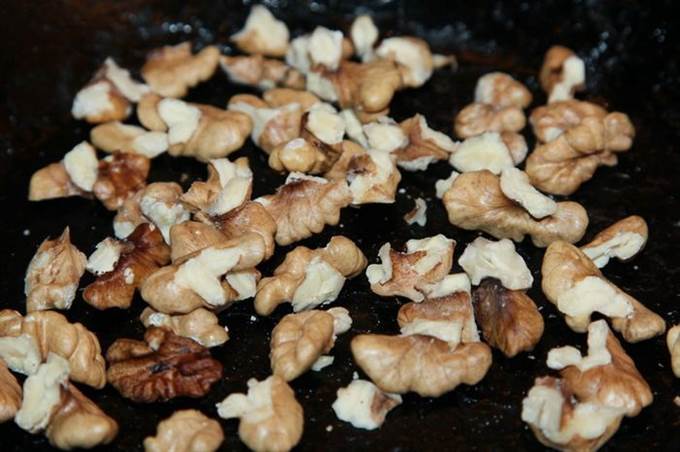 Горсть грецких орехов подсушиваем на сухой сковороде (у меня чугунная). Затем крупно рубим ножом.