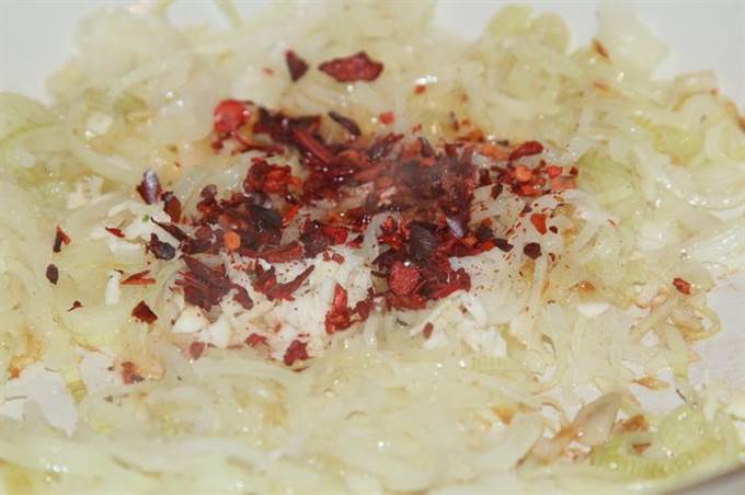 Лук режем полукольцами и на растительном масле доводим до прозрачности. Затем добавляем перцы и чеснок и, помешивая, доводим до готовности в течение 1 минутки.