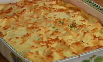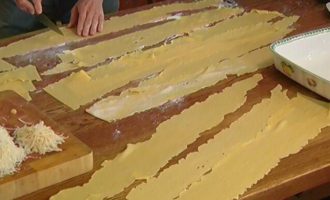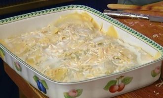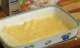 Огнеупорную керамическую форму смазать оливковым маслом, присыпать мелко натертым пармезаном, разложить пласты теста так, чтобы дно было полностью покрыто.
