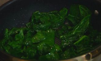Разогреть в сковороде 1 ст. ложку оливкового масла и сливочное масло, выложить шпинат, посолить, поперчить, добавить мускатный орех, перемешать и дать шпинату «поплыть», чтобы он стал мягким.