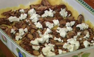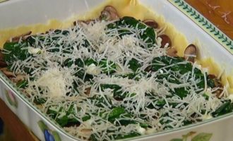Выложить сверху еще пласты теста и повторить очередность слоев — грибы, мягкий козий сыр, шпинат, натертый твердый козий сыр.