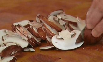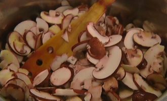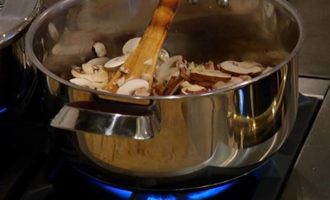 Разогреть в кастрюле 1-2 ст. ложки оливкового масла, выложить грибы, посолить, поперчить и обжарить. Если нужно, добавить еще оливкового масла.