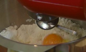 Приготовить тесто: 300 г муки перемешать в комбайне насадкой для теста вместе с семолиной и 1/2 ч. ложки морской соли, затем, не выключая комбайна, по одному ввести яйца и желтки.