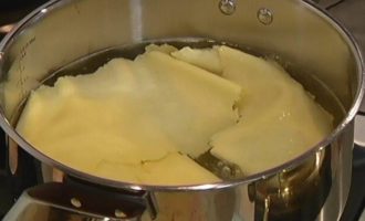 Вскипятить в кастрюле воду, подсолить ее и отваривать пласты теста в течение 2 минут (не переварить, чтобы тесто не расползлось!).