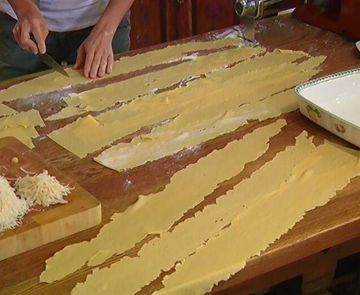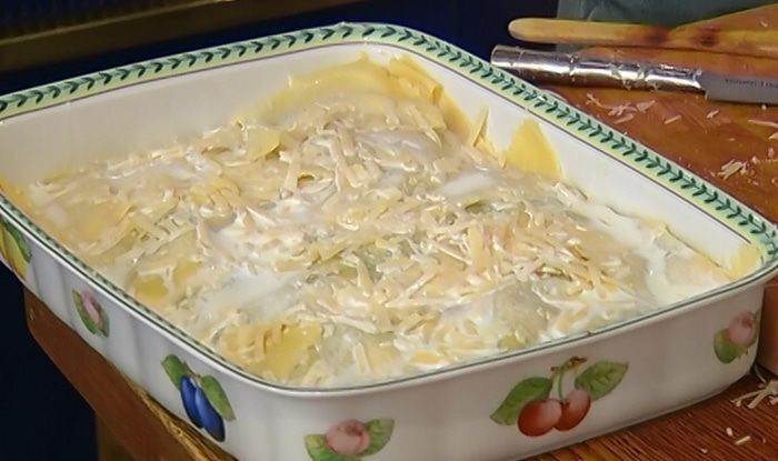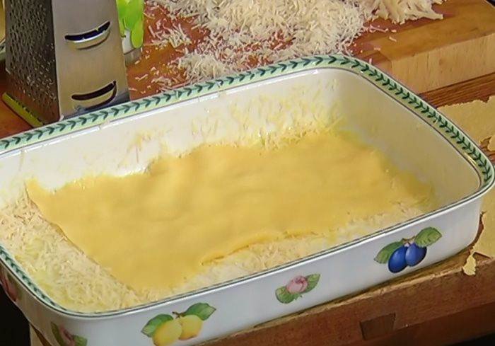 Огнеупорную керамическую форму смазать оливковым маслом, присыпать мелко натертым пармезаном, разложить пласты теста так, чтобы дно было полностью покрыто.