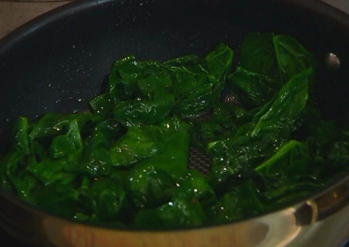Разогреть в сковороде 1 ст. ложку оливкового масла и сливочное масло, выложить шпинат, посолить, поперчить, добавить мускатный орех, перемешать и дать шпинату «поплыть», чтобы он стал мягким.