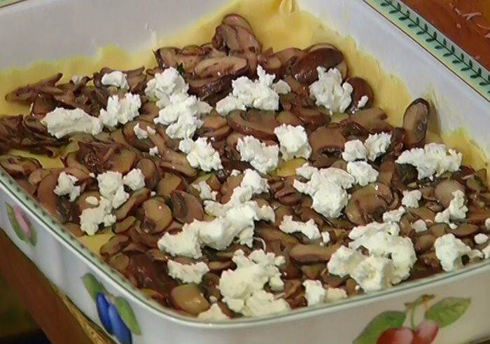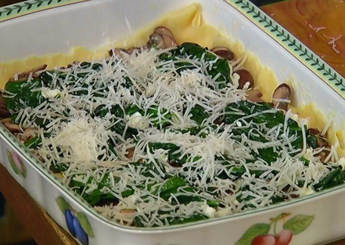 Выложить сверху еще пласты теста и повторить очередность слоев — грибы, мягкий козий сыр, шпинат, натертый твердый козий сыр.