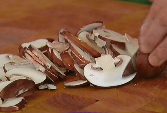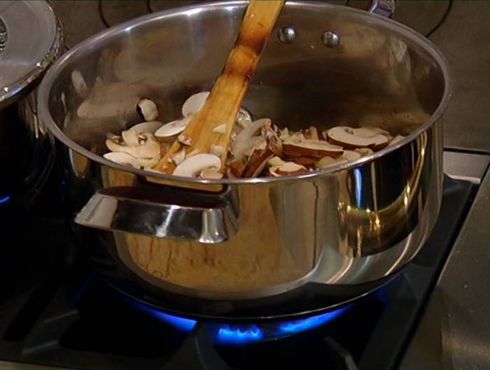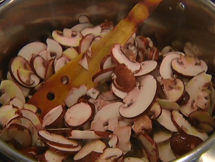 Разогреть в кастрюле 1-2 ст. ложки оливкового масла, выложить грибы, посолить, поперчить и обжарить. Если нужно, добавить еще оливкового масла.