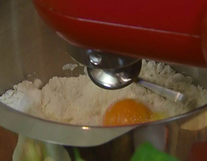 Приготовить тесто: 300 г муки перемешать в комбайне насадкой для теста вместе с семолиной и 1/2 ч. ложки морской соли, затем, не выключая комбайна, по одному ввести яйца и желтки.