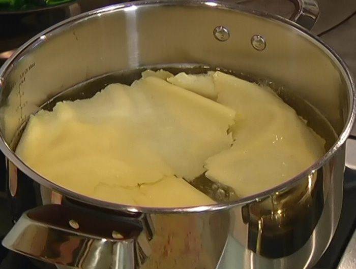 Вскипятить в кастрюле воду, подсолить ее и отваривать пласты теста в течение 2 минут (не переварить, чтобы тесто не расползлось!).