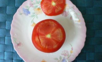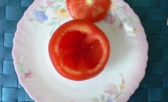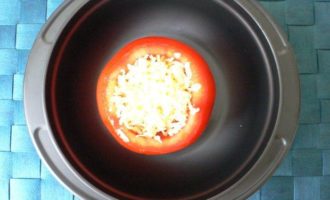Внутрь помидора разбить яйцо, посолить, поперчить и посыпать натёртым сыром.