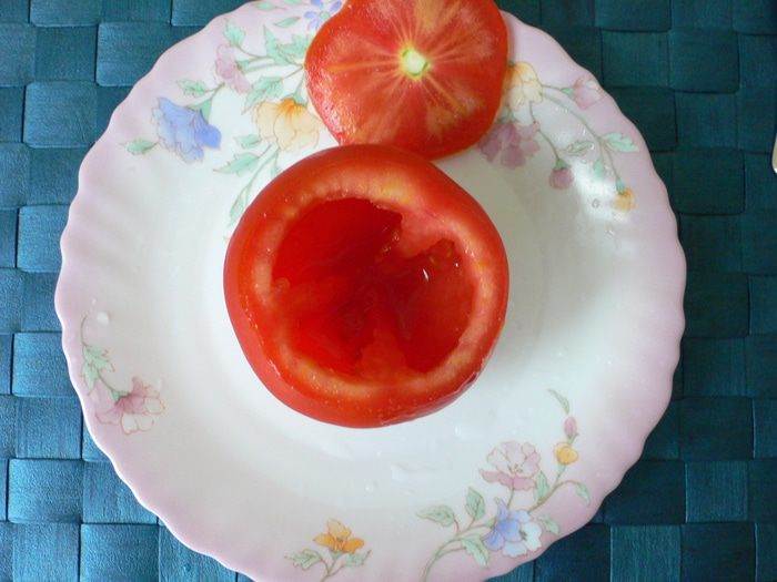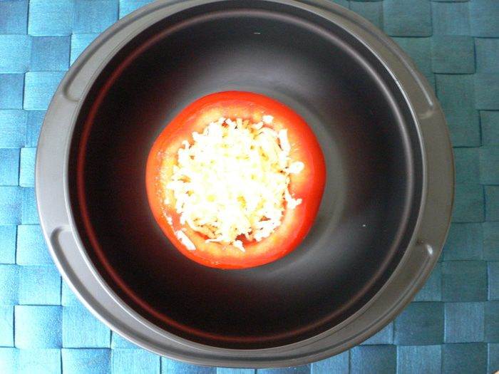 Внутрь помидора разбить яйцо, посолить, поперчить и посыпать натёртым сыром.