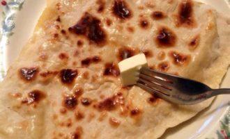 • Готовую лепешку с мясом смазываем растопленным или как я кусочком сливочного масла, обязательно с двух сторон.