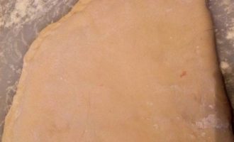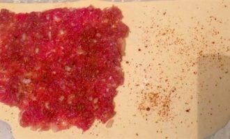 Раскатайте тесто где то 2 мм в толщину, разрежьте круг пополам и выложите на одну сторону фарш, присыпав это все грузинскими специями к шашлыку.