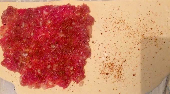 Раскатайте тесто где то 2 мм в толщину, разрежьте круг пополам и выложите на одну сторону фарш, присыпав это все грузинскими специями к шашлыку.