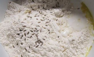 Муку смешиваем с разрыхлителем, тмином и вводим в яичную смесь. -