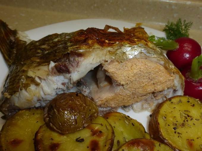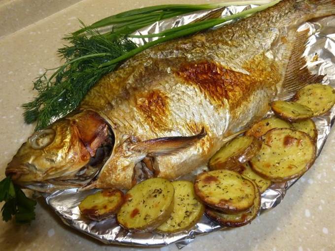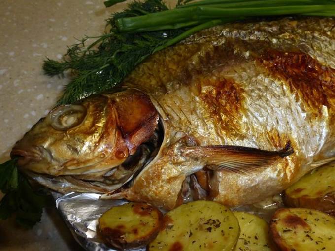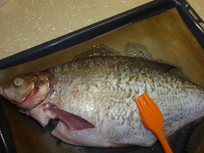 • Смазываем противень (или положенную на него фольгу) подсолнечным маслом и укладываем на него леща, которого сверху также обильно смазываем маслом. Запекаем рыбу до готовности при температуре 180 — 200 гр. У меня ушло на запекание, с учетом того, что внутри леща сырая икра, 50-60 минут. В процессе готовки пару раз достаем рыбу из духовки, чтобы смазать маслом.