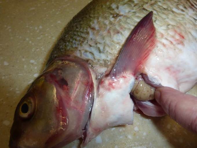 • Теперь необходимо удалить у рыбы внутренности, не разрезая леща, чтобы икра, которая находится внутри, не была сухой. Делаем разрез между двумя верхними плавниками и очень аккуратно, стараясь не повредить желчь, извлекаем внутренности. У леща внутри остаются только икра и пузырь. Под проточной водой еще раз моем рыбу сверху и внутри. Натираем леща солью и пытаемся посолить его через верхний разрез