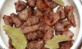 Поджаренное мясо сложить в кастрюльку, добавить лавровый лист и кориандр, пару горошин черного перца. Залить кипятком, чтобы вода была на 1 см выше мяса и варить 35 минут. Затем извлечь лавровый лист.