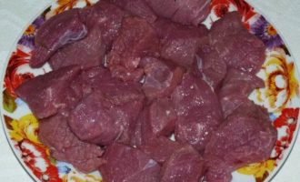 Телятину порезать на кусочки. Обжарить со всех сторон на растительном масле до тех пор, пока не испарится лишняя жидкость, которая появилась при жарке мяса. У меня на это ушло 20 минут.