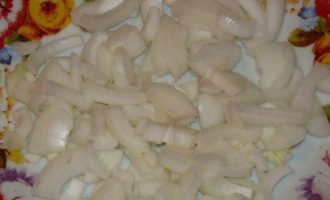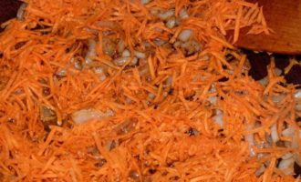 Тем временем лук нарезать полукольцами. Морковь натереть на терке.